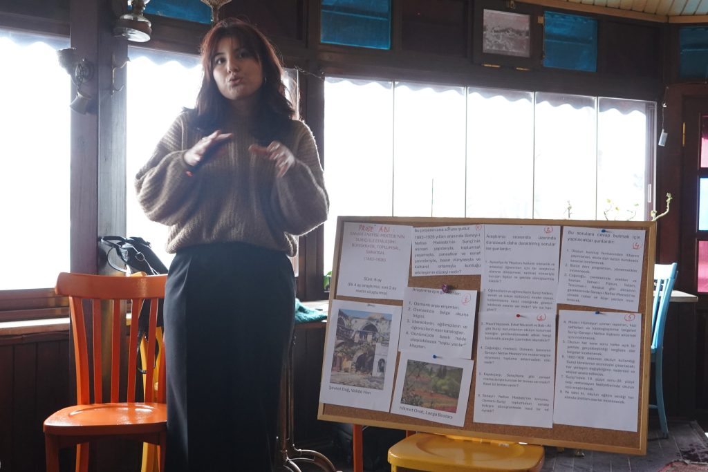 Kübra’nın araştırma projesi olarak tasarladığı bu çalışma, Sanayi-i Nefise Mektebi’nde eğitim veren ve alan ressamların Suriçi ile kurdukları sanatsal ilişkiyi incelemeyi amaçlıyor. Projenin çıktısının metin ve ressamların eserlerini içeren bir katalog birleşimi olması planlanıyor. Editör desteği, resim incelemeleri ve belgelere erişim ihtiyaçları paylaşıldı. Topluluktan gelen geri bildirimlerde akademik olarak sadeleştirme ve çalışmanın kapsamının sınırlandırılması önerildi. Projenin altı ayda tamamlanmasının gerçekçiliği tartışıldı ve oldukça ilgi gören proje revize edilerek geliştirilmeye açık olarak değerlendirildi.