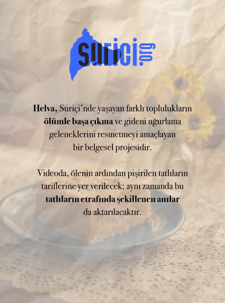 Helva, Suriçi’nde yaşayan farklı toplulukların ölümle başa çıkma ve gideni uğurlama geleneklerini resmetmeyi amaçlayan bir belgesel projesidir. Videoda, ölenin ardından pişirilen tatlıların tariflerine yer verilecek; aynı zamanda bu tatlıların etrafında şekillenen anılar da aktarılacaktır.